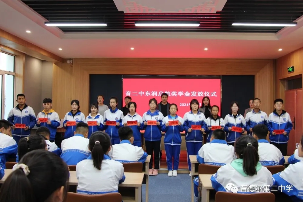 据了解东润启航公司向扎赉特旗音德尔第二中学的14名品学兼优家庭困难的优秀学生每人发放1000元助学奖学金,在大家的共同见证下,共计发放14000元奖学金。