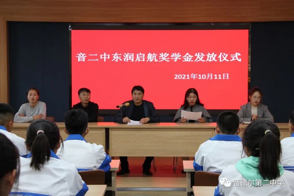 为进一步助力品学兼优的家庭困难学生、激励莘莘学子发奋图强、勤学上进,10月11日下午,音德尔第二中学举行东润启航助学奖学金发放仪式。由德育副校长七十二主持,团委书记英俊、年段组长王塔娜、金山、姚晓荣、获得助学奖学金的同学及家长、高一年段部分学生参加。