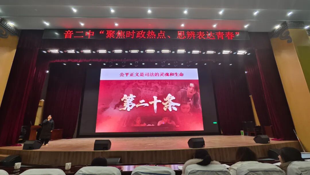 为引导学生关注国家发展、提升综合素养,锤炼逻辑思辨与语言表达能力,近日,由扎赉特旗音德尔第二中学政治教研组组织开展的“热点思辨讲评大赛”在学校报告大厅圆满落幕。高一、高二年级22名学生以青春视角洞察天下事,用理性思考解读时政热点,为全校师生呈现了一场兼具思想深度与表达魅力的视听盛宴。